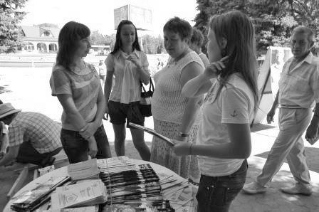 Розташовуємось ми з нашою інформаційною акцією в Сквері Перемоги. До нас долучаються активісти із регіонального ландшафтного парку «Гранітно-степового Побужжя» . Не встигаємо розставити виставку і встановити сонячний колектор, як починають підходити перші зацікавлені жителі Первомайська. Виявляють здивування, що ми спілкуємось «так гарно українською мовою» і що приїхали настільки здалеку. Місцеві жителі говорять, що рідко в них проводять подібні акції та охоче підписуються проти нових ядерних загроз в Україні. Знаходяться і прихильники ядерної енергетики, та що робити з величезною кількістю відпрацьованого ядерного палива та радіоактивними відходами, що накопичуються внаслідок діяльності атомних електростанцій, вони не знають.