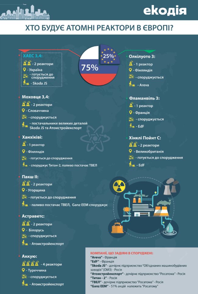 ДетальнішеВ інфографіці міститься інформація про те, які нові атомні реактори плануються та споруджуються у Європі.