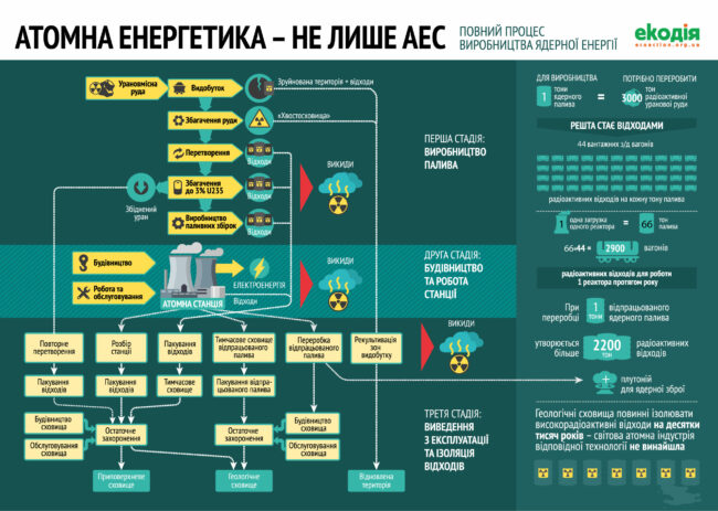 ДетальнішеІнфографіка демонструє повний процес виробництва ядерної енергії, починаючи від виробництво палива і закінчуючи постійним захоронення відпрацьованого палива та виведення з експлуатації та ізоляції відходів.