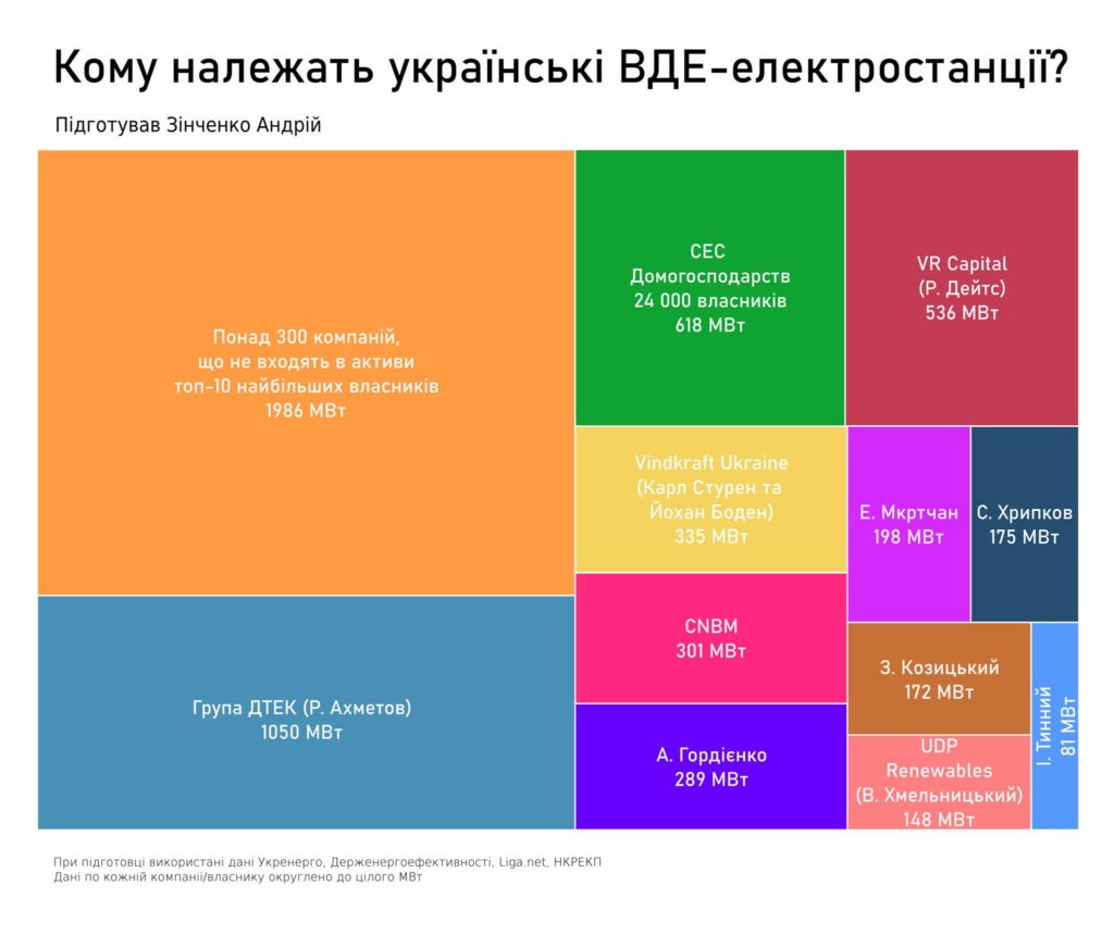 Для порівняння, усю атомну галузь контролює одне підприємство – “Енергоатом”. У вугільній енергетиці кількадесят власників. Прибуток із ВДЕ отримують тисячі.
