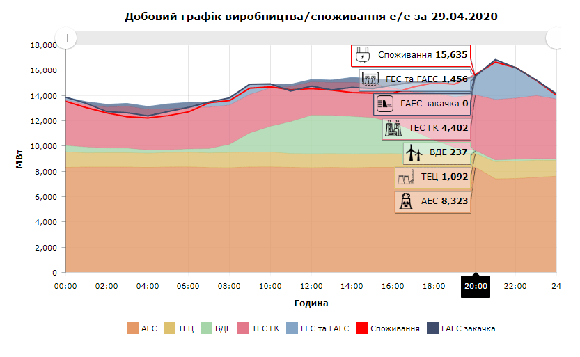 Варто пам’ятати, що АЕС зупиняють не “на користь” того чи іншого виду енергії, а для балансування системи, як ми вже писали раніше. Якщо звернути увагу на графік за добу в квітні 2020, то можна побачити що в період зростання генерації з відновлюваних джерел, в першу чергу зменшується частка теплової електроенергії.